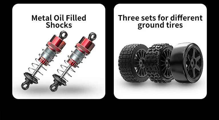 - TPR On-Road Tires + Drift Slick Tires (4pcs each) for multi-surface performance